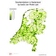 Op de kaart wordt voor heel Nederland de geschatte soortendiversiteit op basis van Rode-Lijstsoorten per kilometerhok in klassen weergegeven op basis van gegevens van de laatste 10 jaar uit de Nationale Databank Flora en Fauna. De acht belangrijkste en best onderzochte soortgroepen zijn hierin samengenomen. In de kaart is gecorrigeerd voor het effect dat er niet op elke locatie even intensief wordt waargenomen.