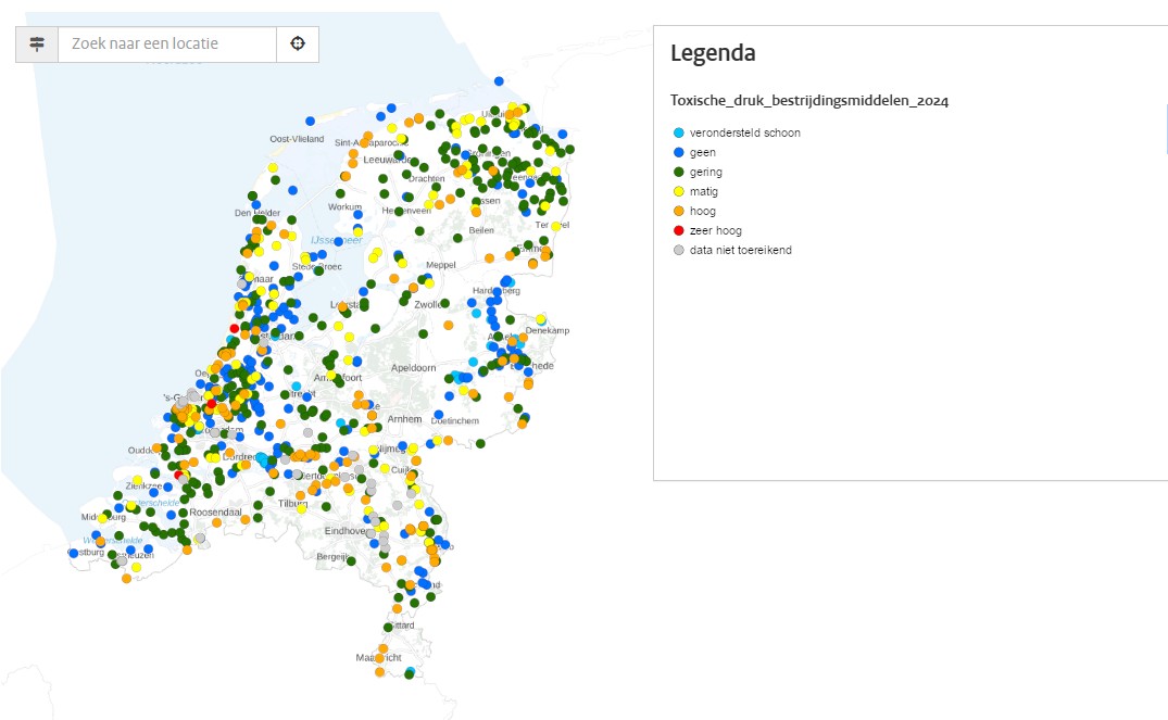 Op de kaart ziet u de mengsel toxische druk (van bestrijdingsmiddelen) per meetpunt in Chemische Verontreinigingsklassen, die gerelateerd zijn aan de mate van effect van stoffen mengsels op de biodiversiteit van 'verondersteld schoon' (licht blauw) tot 'zeer hoog' (rood). Bij grijze stippen kon geen toxische druk worden berekend (door onvoldoende gemeten stoffen of onvoldoende toxiciteitsdata)